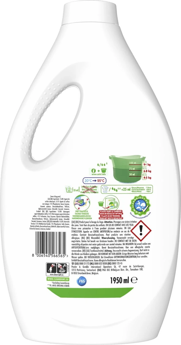 - Recyclebare verpakking: Ariel vloeibaar wasmiddel wordt geleverd in een recyclebare verpakking