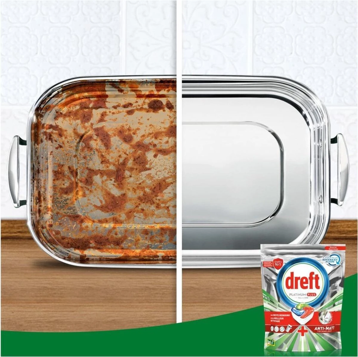Dreft Platinum Plus All in One vaatwascapsules leveren een zo goed als nieuwe vaat. Ze leveren de beste reiniging van Dreft en helpen zelfs de dofheid die na verloop van tijd is opgebouwd weg te nemen om de oorspronkelijke glans van je vaat te herstellen. Dreft Platinum Plus heeft een geïntegreerd voorwassysteem en doet het voorwasprogramma voor je. Met Dreft Platinum Plus hoef je niet voor te spoelen, zodat je water bespaart en milieuvriendelijker bent. Dreft combineert vloeistof en poeder in één krachtige capsule. Het ultra-oplosbare zakje lost snel op en werkt goed in korte cycli omdat het snel begint te reinigen om de klus klaar te krijgen. En ze zijn gemakkelijk te gebruiken. Plaats ze gewoon in het doseerbakje van je vaatwasser, met verpakking.