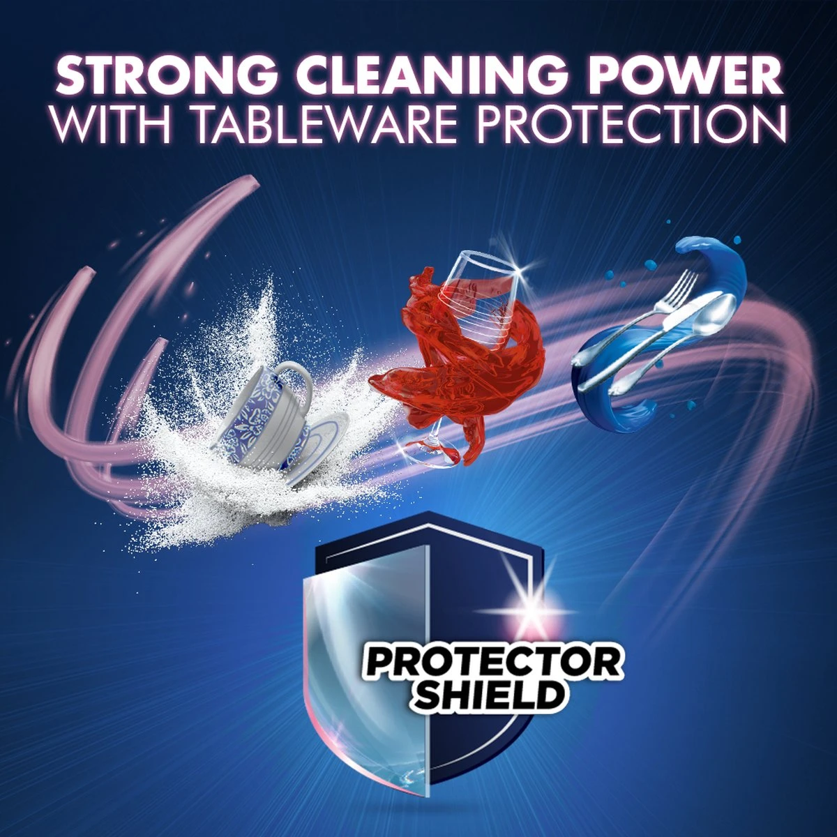 Finish Quantum infinity shine vaatwascapsules geeft een onberispelijke glans en reiniging dankzij onze unieke 3 – compartimentechnologie met protector shield.