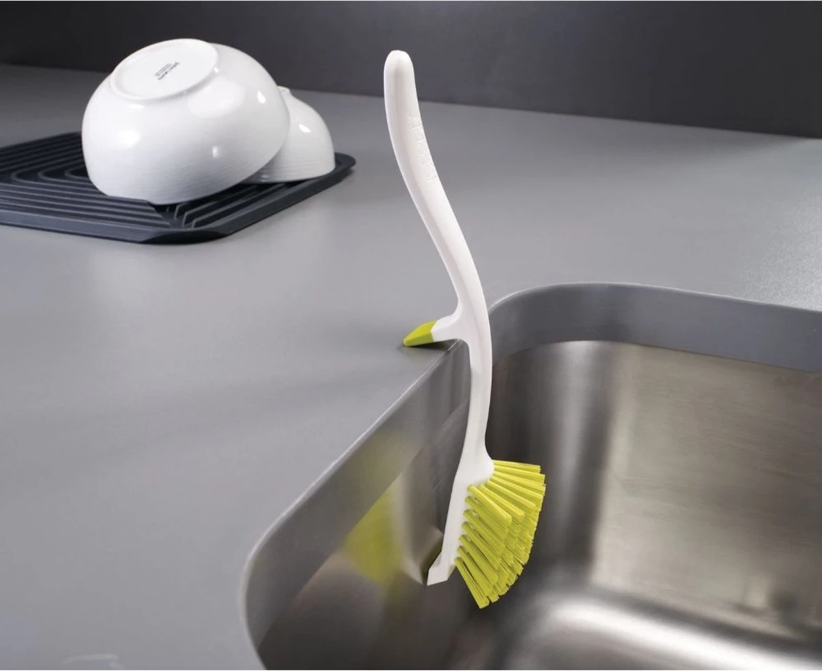 Met de afwasborstel Edge van Joseph Joseph was je eenvoudig al jouw vuile vaat af! Dankzij de harde haren zijn jouw vuile borden in een mum van tijd schoon en de geïntegreerde panschraper zorgt ervoor dat ook jouw pannen zo schoon zijn. Na gebruik hang je de borstel eenvoudig via de gootsteensteun op aan de gootsteen. Hierdoor loopt het overtollige sop en water makkelijk weg in de gootsteen. Jouw afwasborstel is hiermee niet alleen snel schoon, maar bespaart ook nog eens ruimte! Ben je op zoek naar een andere kleur? De afwasborstel is ook te koop in het wit!