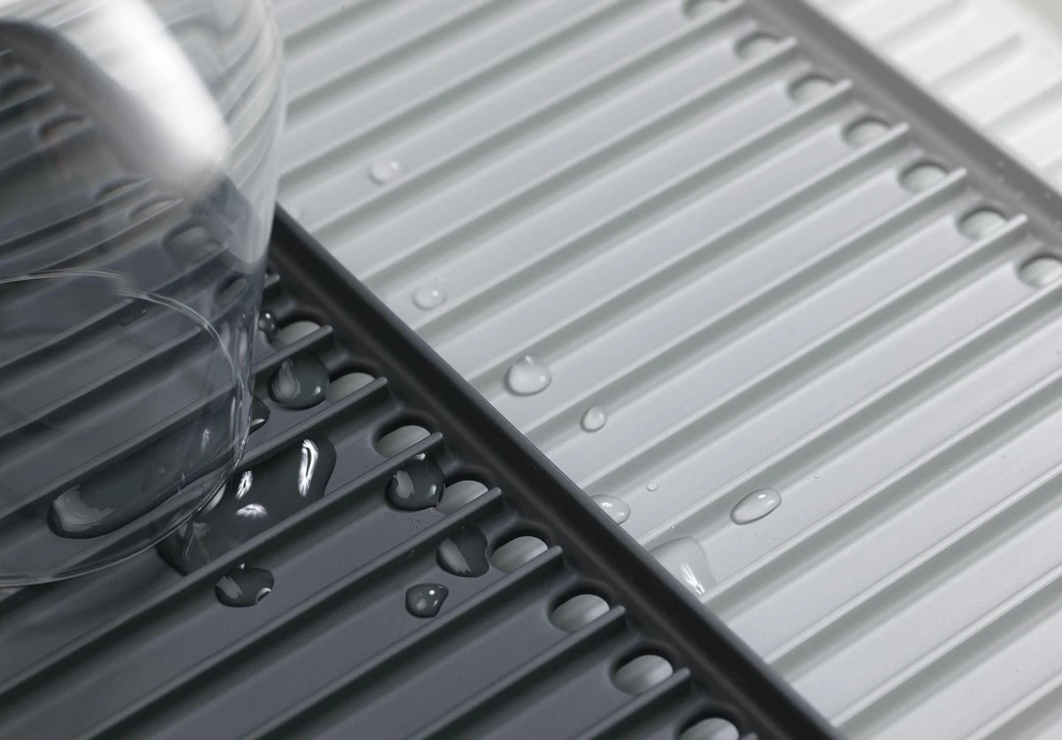 Met de Tier uitschuifbare afdruipmat van Joseph Joseph ben je voortaan verlost van een waterballet op het aanrecht. De mat is uitschuifbaar in 3 delen wat ervoor zorgt dat je genoeg ruimte hebt voor het laten uitlekken van kopjes, glazen en kommen. De mat is voorzien van een eveneens uitschuifbaar afvoergootje waardoor het overtollige water rechtstreeks in de gootsteen gegooid kan worden. De geïntegreerde ribbels zorgen ervoor dat er geen water achterblijft in de kopjes, glazen en kommen. Na gebruik kan de afdruipmat weer worden ingeklapt voor ruimtebesparing.