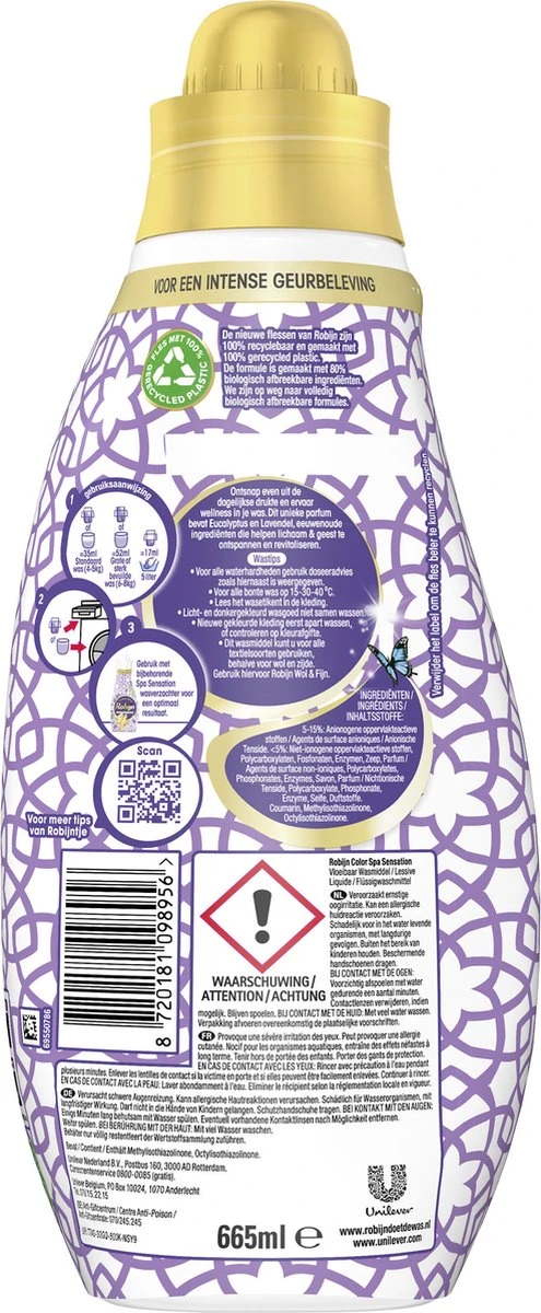 De verbeterde Robijn Spa Sensation formule bevat 80% biologisch afbreekbare ingrediënten. We zijn op weg naar volledig biologisch afbreekbare formules. De vertrouwde effectiviteit en bekende geuren van Robijn, gecombineerd met de kracht van de natuur. Goed voor je kleding en beter voor de planeet. Bovendien zijn de flessen gemaakt van 100% gerecycled en 100% recyclebaar plastic. Op deze manier draagt Robijn bij aan een duurzamere manier van wassen.